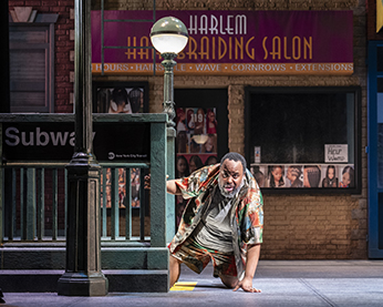 Next door is the Speedy Suds Laundry, where you can get “Wash & Fold,” “Drop Off & Pick Up,” and “Same Day Service.” This business is owned by the Fords, where a large laundry basket is available to cart away Falstaff in his first escape from Mister Nduka Ford (Nick Rashad Burroughs). Above the businesses are air-conditioned tenements, some windows lit by lamps, some by ceiling lights, and metal fire escapes descending down the walls. This is 116th Street in Harlem, with globe-topped green lamppost to one side and a New York Subway station on the other. Sometimes sunshine bathes the neighborhood, other times streetlights cast spotlights against encroaching nighttime in Jeanette Oi-Suk Yew's deft lighting design. The salon and laundromat open up and move forward for interior scenes, Falstaff’s apartment interior (with album covers on the wall) floats down from the catwalks while the Caius Medical Office rises through the stage trap door. I've often criticized Shakespeare Theatre Company's overreliance on overly elaborate sets, but Moten's detailed street scene is exactly right for the reality television feel of this production while authenticating the musically fueled joy-of-living essence permeating this Harlem community (sound design and composition by Mikaal Sulaiman).