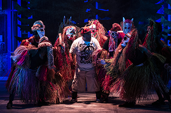 Top, a soaked Falstaff (Jacob Ming-Trent) emerges from the New York Subway station after his misadventures in a Speedy Suds Laundry basket in the Shakespeare Theatre Company's production of Merry Wives, Jocelyn Bioh's adaptation of William Shakespeare's The Merry Wives of Windsor at Harman Hall in Washington, D.C. Above, Falstaff wearing Chicago Bulls antlers, is bewitched by voodoo fairies in this immigrant West African community's take on Shakespeare's play-climaxing masque. What sets Ming-Trent’s performance apart from the gallery of Falstaffs I've seen in the Henry IV plays and Merry Wives is how thoroughly current he makes this iconic, 16th century comic character. Photos by Teresa Castracane.